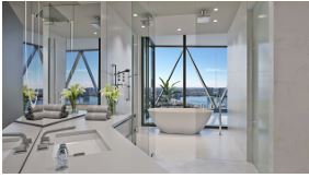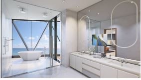 Master suites at Bentley Residences Miami offer refined comfort. They feature stone finishes on floors, walls, and vanities. Bathrooms include Toto Neorest bidet toilets, freestanding tubs with stunning views, and double rain showers. Many residences also include a private sauna and outdoor shower. Behind-mirror televisions, towel warmers, heated floors, and expansive walk-in closets ensure every detail contributes to a truly spa-like ambiance.