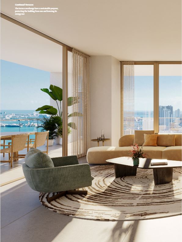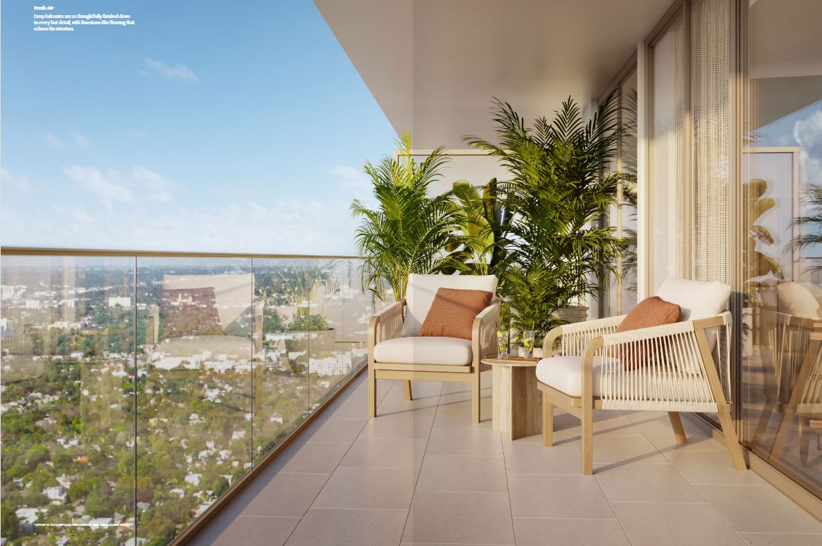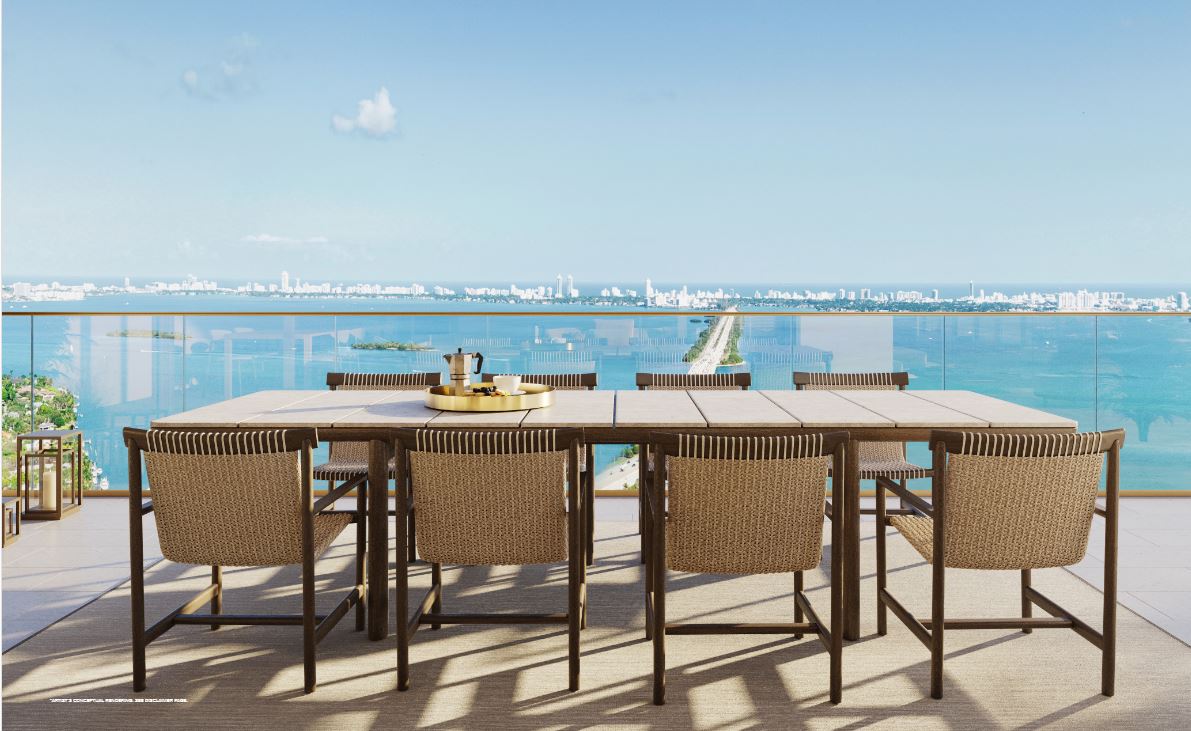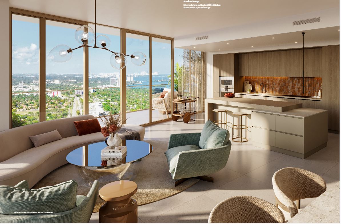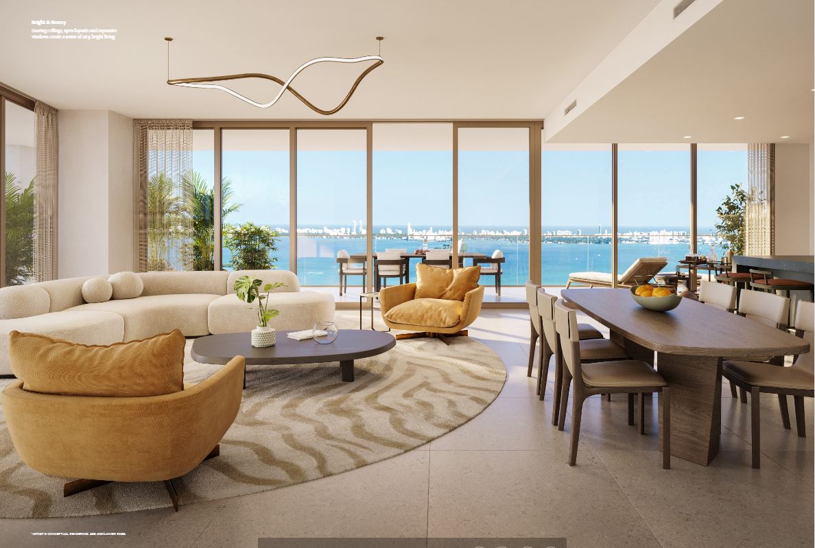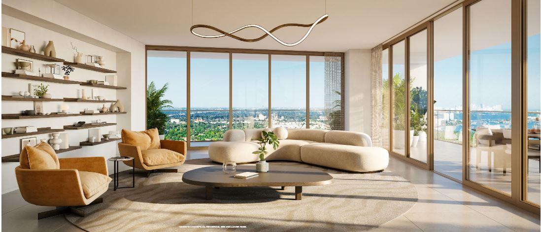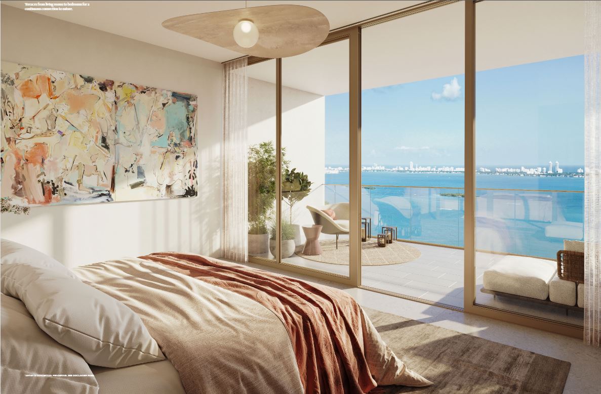 Inside the tower, residences will range from one to four bedrooms. Each unit will feature floor-to-ceiling windows, private terraces, and light-filled interiors. The layouts are open and modern, blending clean lines with warm, tropical materials. From every room, sweeping views of Biscayne Bay or the downtown skyline create an inspiring backdrop.