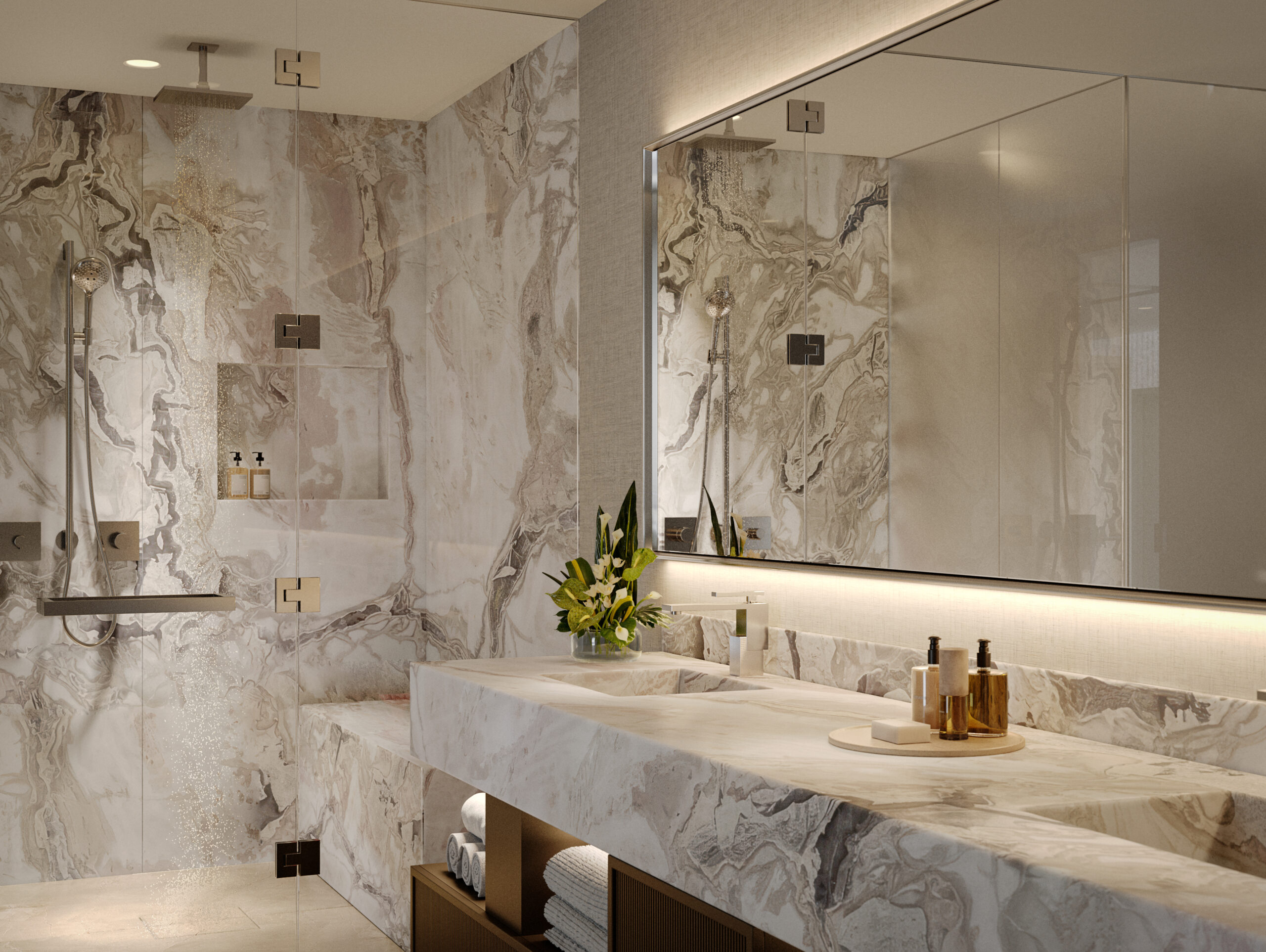 - 65” soaking tubs and full-height luxury shower systems with rainfall showerheads